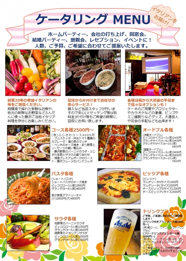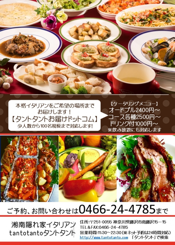 神奈川県藤沢市ケータリング、宅配、お弁当、オードブルの事なら本格イタリアンをご希望の場所までお届け!ケータリングサービス「タントタントお届けドットコム」